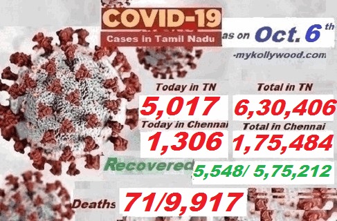 #Covid-19, #Coronavirus in Tamil Nadu – Latest News as on 6th Oct., Corona News By admin Last updated Oct 9, 2020 242 Share தமிழகத்தில் கொரோனாவால் பாதிக்கப் பட்டவர்களின் எண்ணிக்கை 6,30,406-ஆக உயர்வு. இன்று மட்டும் 5,017 பேருக்கு கொரோனா பாதிப்பு உறுதிப்படுத்தப்படுள்ளது. தமிழகத்தில் ஏப்ரல் முதல் வாரத்தில் இருந்து கொரோனா பாதிக்கப்பட்டவர்களின் எண்ணிக்கை அதிகரித்த வண்ணமே இருந்தன. பாதிக்கப்பட்டவர்களின் எண்ணிக்கை 6,30,000–த்தை தாண்டியது. இன்றைய 5,017 எண்ணிக்கையுடன் ஒட்டுமொத்தமாக தமிழகத்தில் இதுவரை 6,30,406 பேர் கொரோனாவால் பாதிக்கப்பட்டுள்ளனர். இன்று 5,017 பேர் புதிதாக பாதிக்கப்பட்டனர். இதில் 1,306 பேர் சென்னை சேர்ந்தவர்கள் ஆவார்கள். இதனால் சென்னையில் பாதிக்கப் பட்டவர்களின் எண்ணிக்கை 1,75,484. இன்று 5,548 பேர் குணமடைந்து வீடு திரும்பியுள்ளனர். இதுவரை மொத்தமாக 5,75,212 பேர் குணமடைந்து வீடு திரும்பியுள்ளனர். இறப்பு –71/ 9,917 242 Share