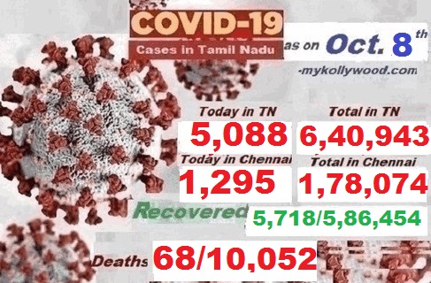 #Covid-19, #Coronavirus in Tamil Nadu – Latest News as on 8th Oct., Corona News By admin On Oct 9, 2020 205 Share தமிழகத்தில் கொரோனாவால் பாதிக்கப் பட்டவர்களின் எண்ணிக்கை 6,40,943-ஆக உயர்வு. இன்று மட்டும் 5,088 பேருக்கு கொரோனா பாதிப்பு உறுதிப்படுத்தப்படுள்ளது. தமிழகத்தில் ஏப்ரல் முதல் வாரத்தில் இருந்து கொரோனா பாதிக்கப்பட்டவர்களின் எண்ணிக்கை அதிகரித்த வண்ணமே இருந்தன. பாதிக்கப்பட்டவர்களின் எண்ணிக்கை 6,40,000–த்தை தாண்டியது. இன்றைய 5,088 எண்ணிக்கையுடன் ஒட்டுமொத்தமாக தமிழகத்தில் இதுவரை 6,40,943 பேர் கொரோனாவால் பாதிக்கப்பட்டுள்ளனர். தமிழகத்தில் இன்று 5,088 பேர் புதிதாக பாதிக்கப்பட்டனர். இதில் 1,295 பேர் சென்னை சேர்ந்தவர்கள் ஆவார்கள். இதனால் சென்னையில் பாதிக்கப் பட்டவர்களின் எண்ணிக்கை 1,78,074. இன்று 5,718 பேர் குணமடைந்து வீடு திரும்பியுள்ளனர். இதுவரை மொத்தமாக 5,86,454 பேர் குணமடைந்து வீடு திரும்பியுள்ளனர். இறப்பு –68/ 10,052 205 Share