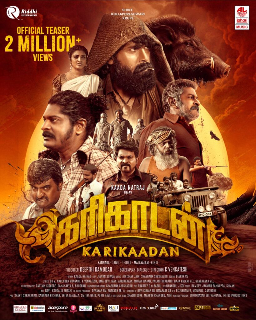 கன்னடத் திரையுலகில் இருந்து புதிய இளைஞர்கள் படைப்பாளிகளாக வந்து இப்போது கவனிக்க வைக்கிறார்கள்.அப்படி அவர்களால் உருவாக்கப்பட்ட ‘கேஜிஎஃப்’, ‘காந்தாரா ‘ படங்கள் பெரிய வெற்றி பெற்றுக் கவனம் ஈர்த்தன. அந்தப் படங்கள் பெற்ற வரவேற்பைப் போலவே கன்னடக் கலைஞர்கள் கூட்டணியில் கன்னடம், தமிழ், தெலுங்கு, மலையாளம், ஹிந்தி என ஐந்து மொழிகளில் பான் இந்தியா திரைப்படமாக உருவாகி இருக்கும் ‘கரிகாடன்’ படத்தின் டீசரும் பெரும் வரவேற்பு பெற்றுள்ளது. டீசர் வெளியான குறுகிய காலத்திலேயே இரண்டு மில்லியன் பார்வைகளைப் பெற்று புதிய சாதனை படைத்துள்ளது.படத்தின் டீசர் பார்வையாளர்களிடம் அதிர்வலைகளை ஏற்படுத்திக் கவனிக்க வைக்கிறது.